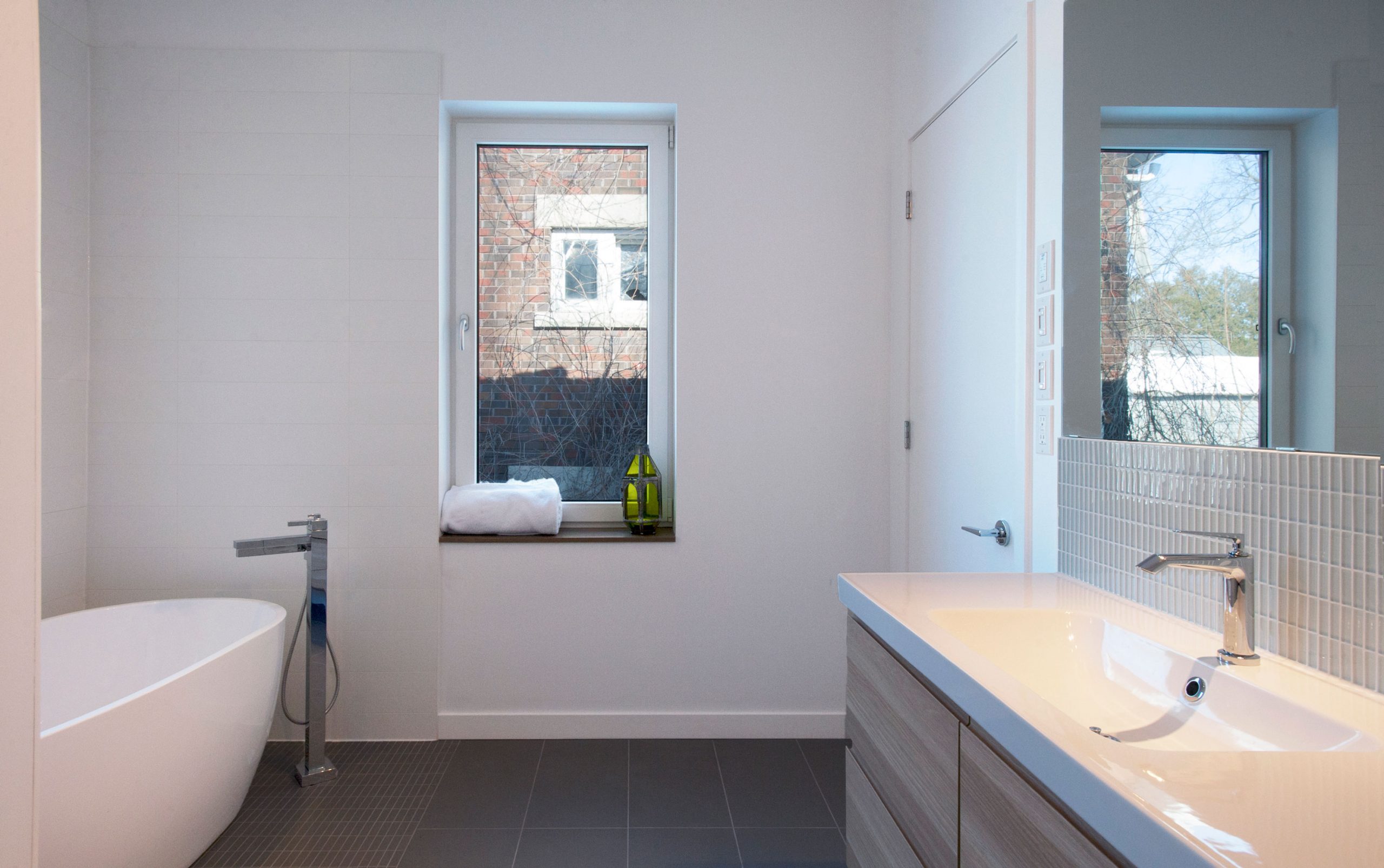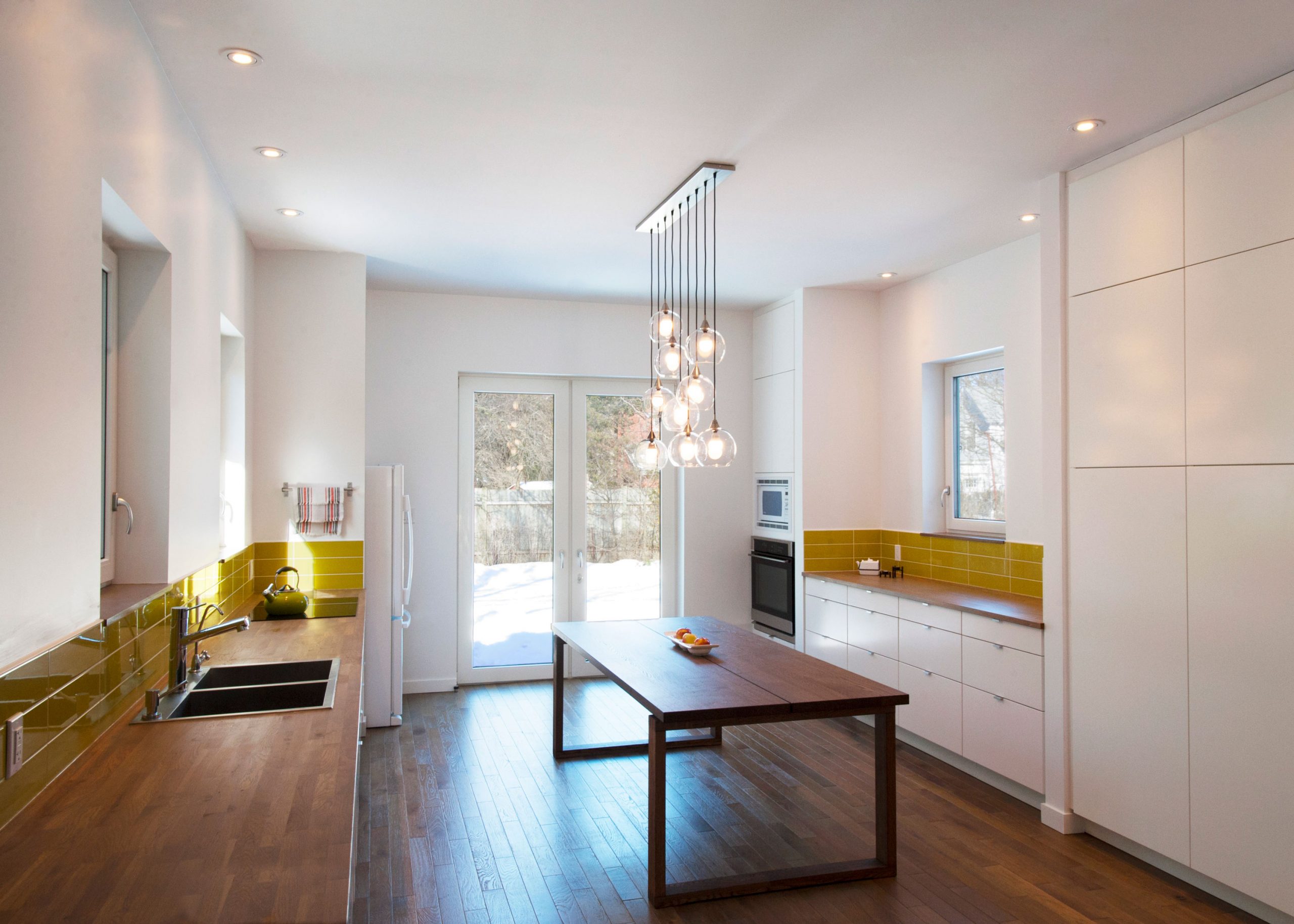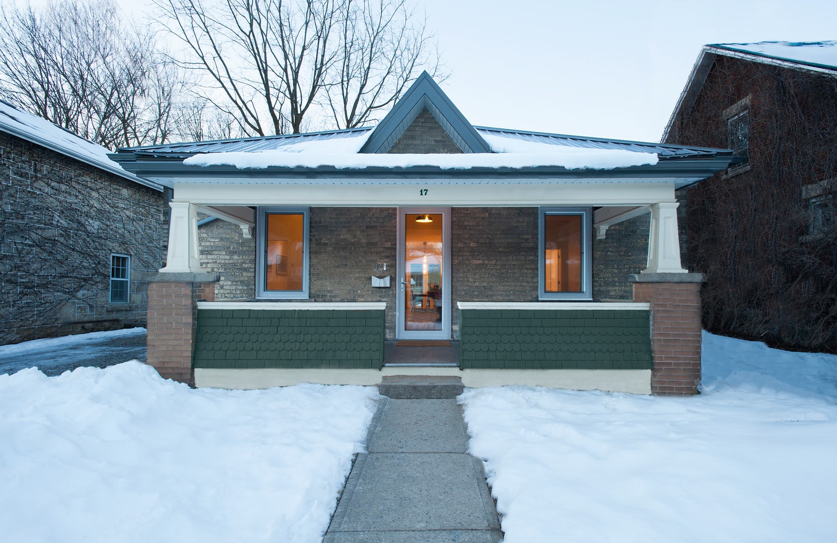 This 2017 retrofit of a 100 year old home near downtown Guelph included a fully renovated main floor and basement level. The lower level was underpinned to increase the headroom clearance and to allow more light to enter the space. Beyond that, two additions were removed from the rear of the property to allow for more light to enter the space. The building is heated through electric baseboards due to the extremely air-tight envelope, essentially the high levels of insulation meant the baseboards were hardly required. The concrete slab was R-20, the walls were R-35 and the roof R-60, this along with a tight building envelope helped to achieve a low air change rate per hour. Above all, the principles of air-tightness, high insulation levels, ventilation and superior quality windows were crucial for the success of this project.